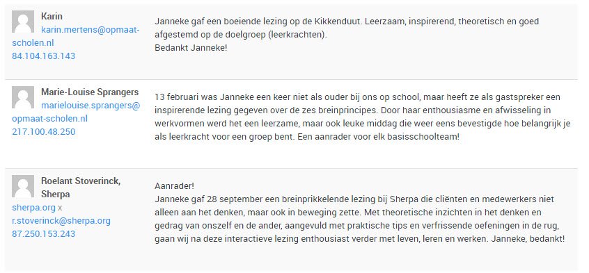 De presentaties bevatten veelal een hoog tempo en zijn zeer duidelijk en didactisch sterk opgebouwd. De sessies bevatten een hoog energiegehalte en breinproof. Afhankelijk van de wens van de klant zijn haar presentaties interactief of hebben het karakter van een workshop. Het aantal deelnemers is in principe onbegrensd. Onderstaand enkele veelgevraagde onderwerpen. Uiteraard is maatwerk ook mogelijk.
